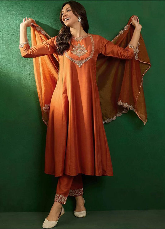 Rust Orange Embroidered Kurta Set with Pants and Dupatta
