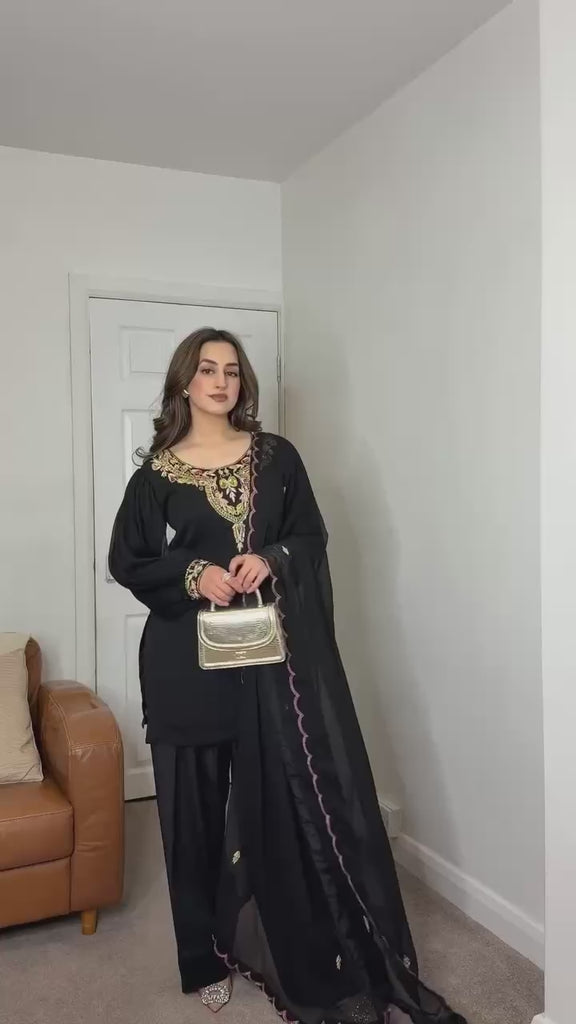 Black straight-cut embroidered suit with dhoti pants and contrast-edge dupatta