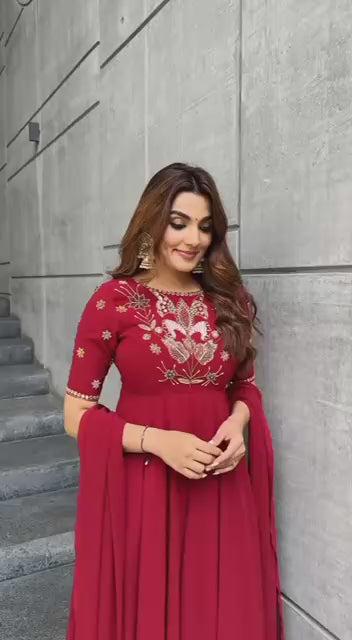 Maroon georgette embroidered high-low kurti paired with straight pants and a matching draped dupatta